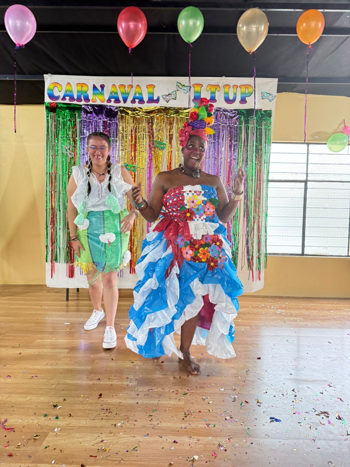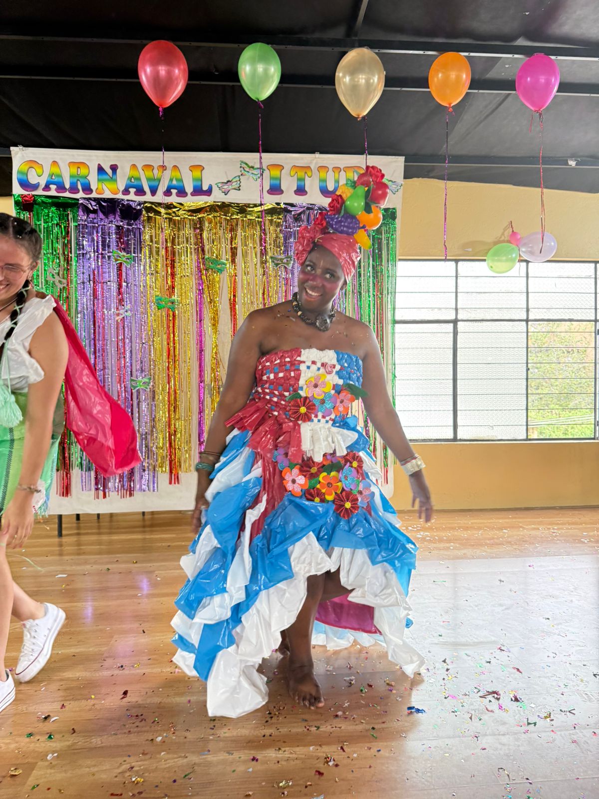 Uno de los elementos más innovadores del programa fue la elaboración de trajes reciclados, diseñados y confeccionados por los propios equipos participantes. Esta iniciativa fomentó el trabajo en equipo, la creatividad y la conciencia ambiental, evidenciándose en una pasarela que reflejó el esfuerzo y compromiso de cada grupo.