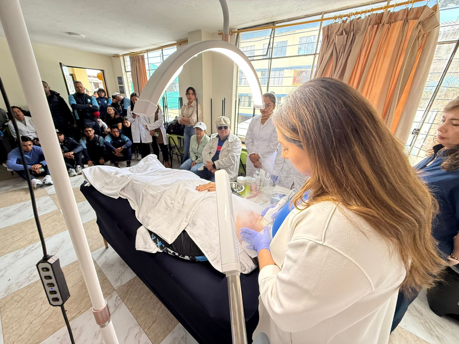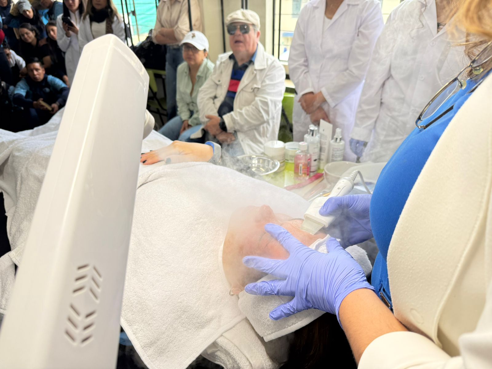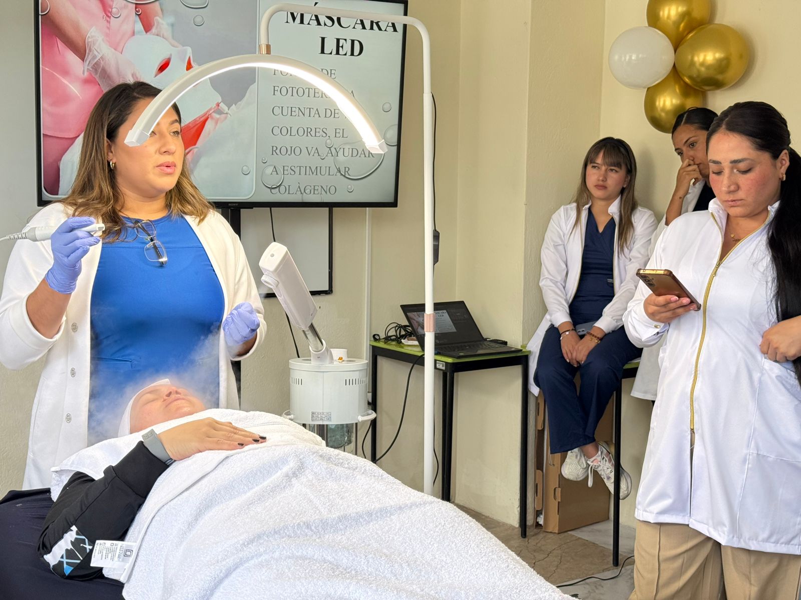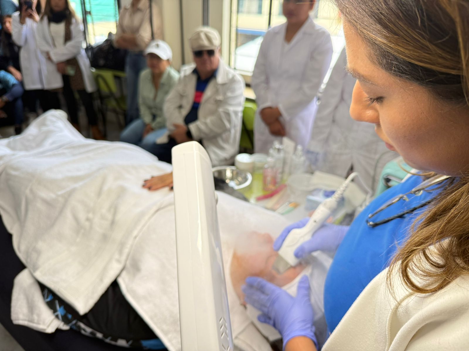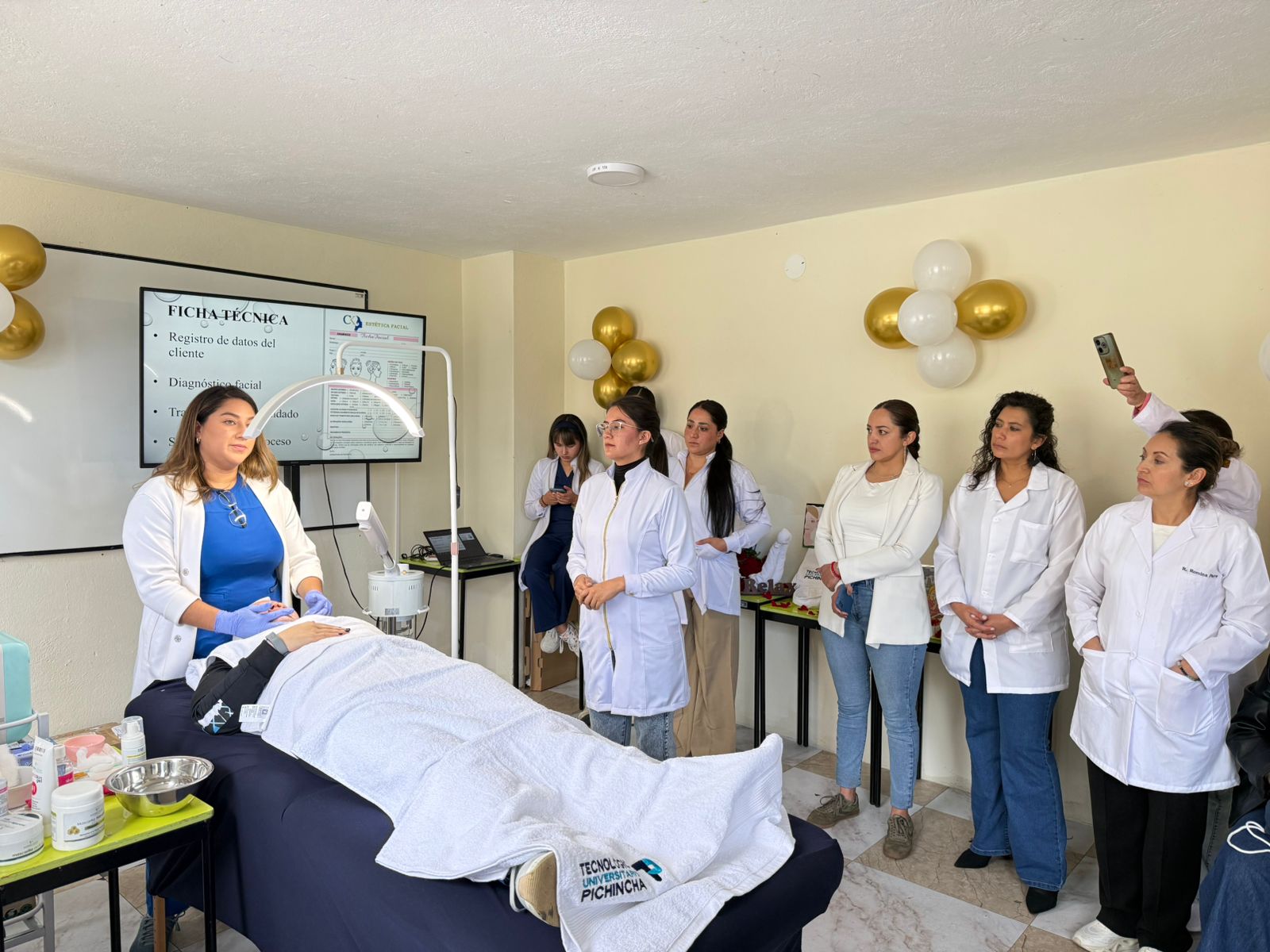 Como parte destacada de esta Casa Abierta, la carrera de Estética Integral ofreció limpiezas faciales, bajo la dirección de la MSc. Karen Cadena, quien junto a sus estudiantes realizó demostraciones del uso de aparatología de última tecnología. Esta actividad evidenció la calidad de la formación práctica y el acceso a herramientas especializadas que fortalecen el aprendizaje de las mejores técnicas en el ámbito de la belleza y la estética.