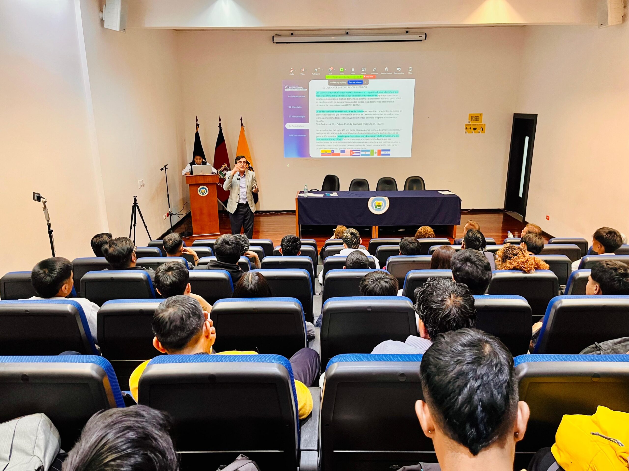 La mañana inició con la conferencia “Tecnologías emergentes y aplicaciones en investigación y ciencia abierta”, presentada por el MSc. Pablo Crespo de CEDIA, quien resaltó la importancia de integrar herramientas tecnológicas al proceso científico.